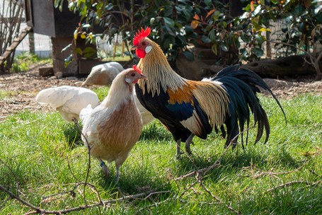Coq et poule avec plumage blanc pur ; chez le coq, légers reflets crème dans les parures.